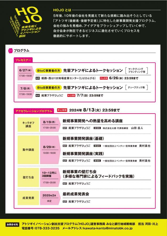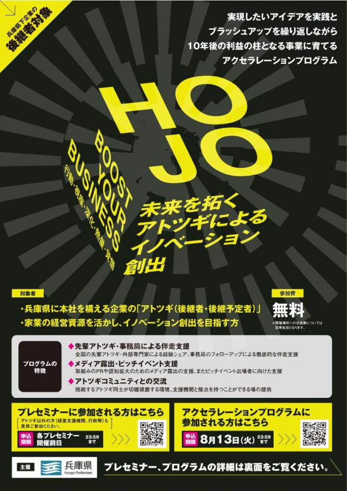 HOJOプログラム1期生や先輩アトツギをお招きし、「アトツギによるイノベーション創出」について深堀りすることで、アトツギが地域で起こすイノベーションやアトツギ支援の必要性を理解いただくとともにアトツギや支援機関等によるコミュニティ形成を促進する、プレセミナーを神戸・姫路にて開催します。