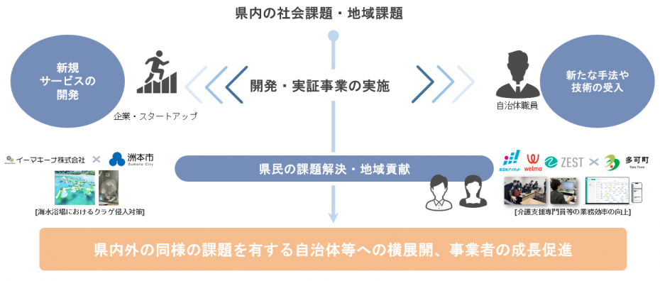 県内の社会課題をスタートアップ等が有する革新的な技術を活用して解決を図り、その成果を同様の課題を有する県内外市町に横展開する。