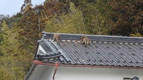 2つ隣の農具倉庫の上で数匹が毛づくろいタイム。一見微笑ましい光景だが、住民からすれば、田畑を荒らす迷惑者。なんとか追い払いたい。