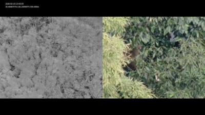 サルの警戒音を出しながらドローンがサルに近づく。すると、ものの一瞬でサルの姿は山へ消えていく。