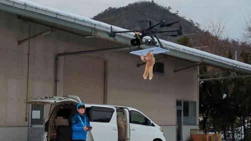 ぬいぐるみをぶら下げての飛行ということで、熟練の宇佐美さんがドローン操縦を担当。空に浮かぶドローンとぬいぐるみの組み合わせは奇妙で、まるでUFOにぶら下がるエイリアンのようだ。
