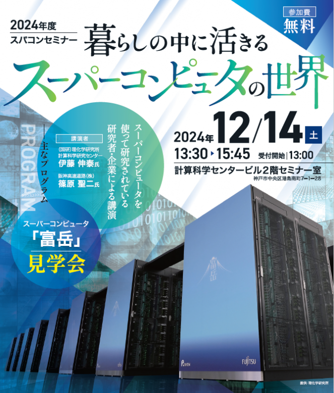 世界最高水準の性能と汎用性を有するスーパーコンピュータ「富岳」を紹介するとともに、スーパーコンピュータやシミュレーションの活用が私たちの与える影響についてわかりやすく解説するセミナーを開催します。今年度は「質問会・意見交換会」と題し、ご参加いただく皆様からの質問をもとに、登壇者に講演内容やスパコン活用の現状等についてより詳しくお話いただく時間も設けております。皆様のご参加をお待ちしております!
