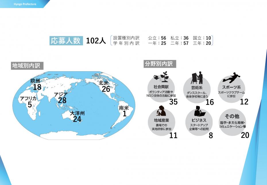 令和6年4月2日から令和6年5月10日まで参加者の募集を行いました。その結果、合計102名の兵庫県内の高等学校等に在籍する高校生から応募をいただきました。