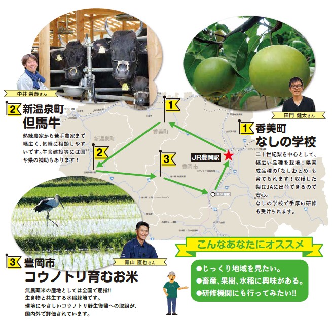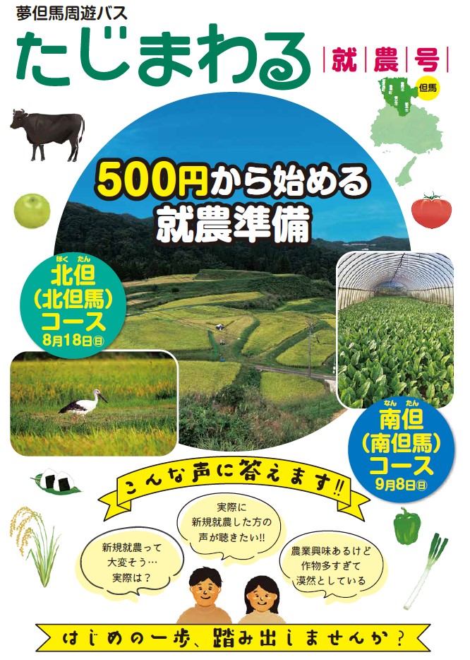 但馬地域での就農と移住に関心がある人を対象に、夢但馬周遊バス「たじまわる」で農家を巡る日帰り見学ツアーを昨年に引き続き開催します。北但と南但の2コースで、いずれも参加費500円です。特色ある農業の現場を見て回りながら、現地の自然に触れ、ベテラン農家や新規就農者の声を聞くことで、就農後の具体的な姿を描いてみませんか。