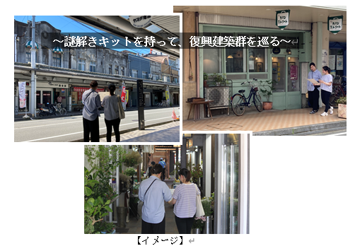 そこで、これらのポテンシャルを活かした取組として、地域に点在する復興建築をめぐる謎解きツアープログラムを開発し、来訪客の滞在時間を増やし、地域の賑わい再生を目指します。