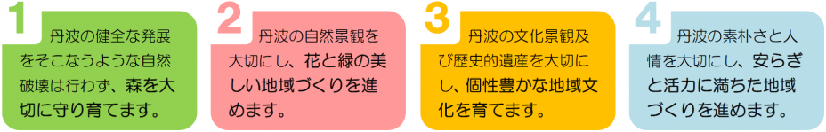 丹波の自然と文化は、現在及び将来にわたる住民共有の財産であって、これを維持発展させることは私たちに課せられた重大な責務です。