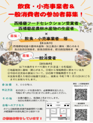 西播磨地域産の農林水産物・加工食品に興味・関心のある飲食店関係者、宿泊施設関係者、食品販売関係者等