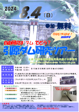 子供たちの一夏の体験として、「引原ダム研究ツアー自由研究は【ダム】でどう?」を8月4日(日曜日)に開催し、小学生の親子33組88名に参加頂きました。子どもたちからは、「ダムのことをたくさん知れたし、放流の迫力がすごかった。」、「ダムが重要な役割を担っていることが分かった。」などの感想をいただきました。