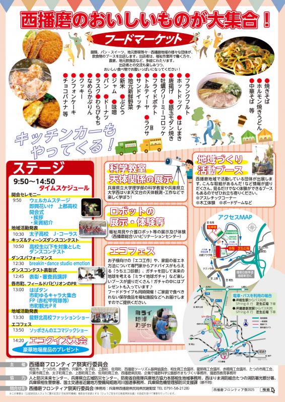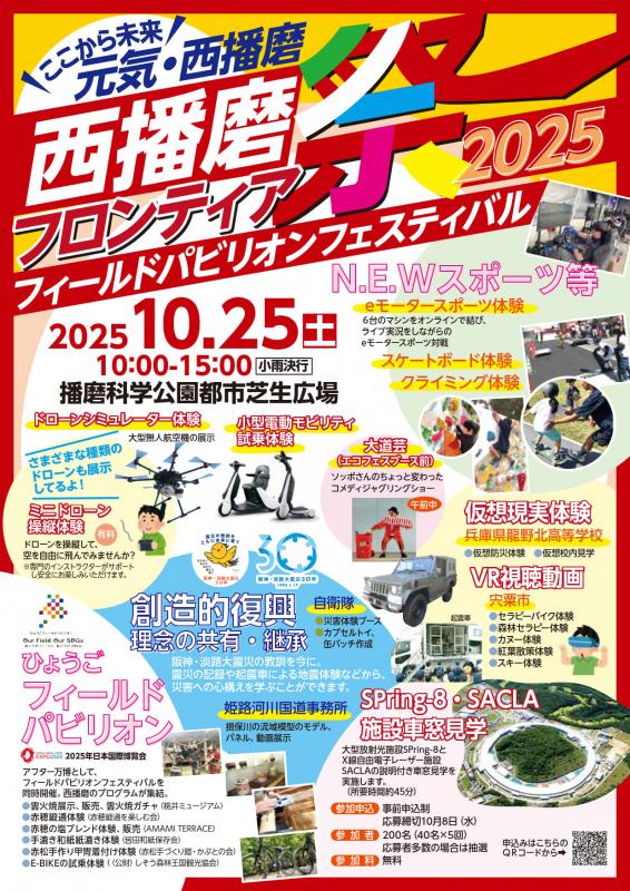 平成14年度から、新型コロナ禍の3年を除いて毎年度開催し、西播磨地域の恒例行事となっている西播磨フロンティア祭2025。今年度は、10月25日(土曜日)に、播磨科学公園都市芝生広場で、万博のテーマ「いのち輝く未来社会のデザイン」を踏まえて、「ここから未来 元気・西播磨」を合言葉に開催します。