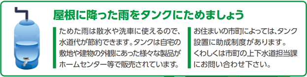 ご家庭でも、屋根からの水をタンクに貯めたり、庭に花壇を作ったり、駐車場を芝生にすることで、河川への流出を抑えることができます。
